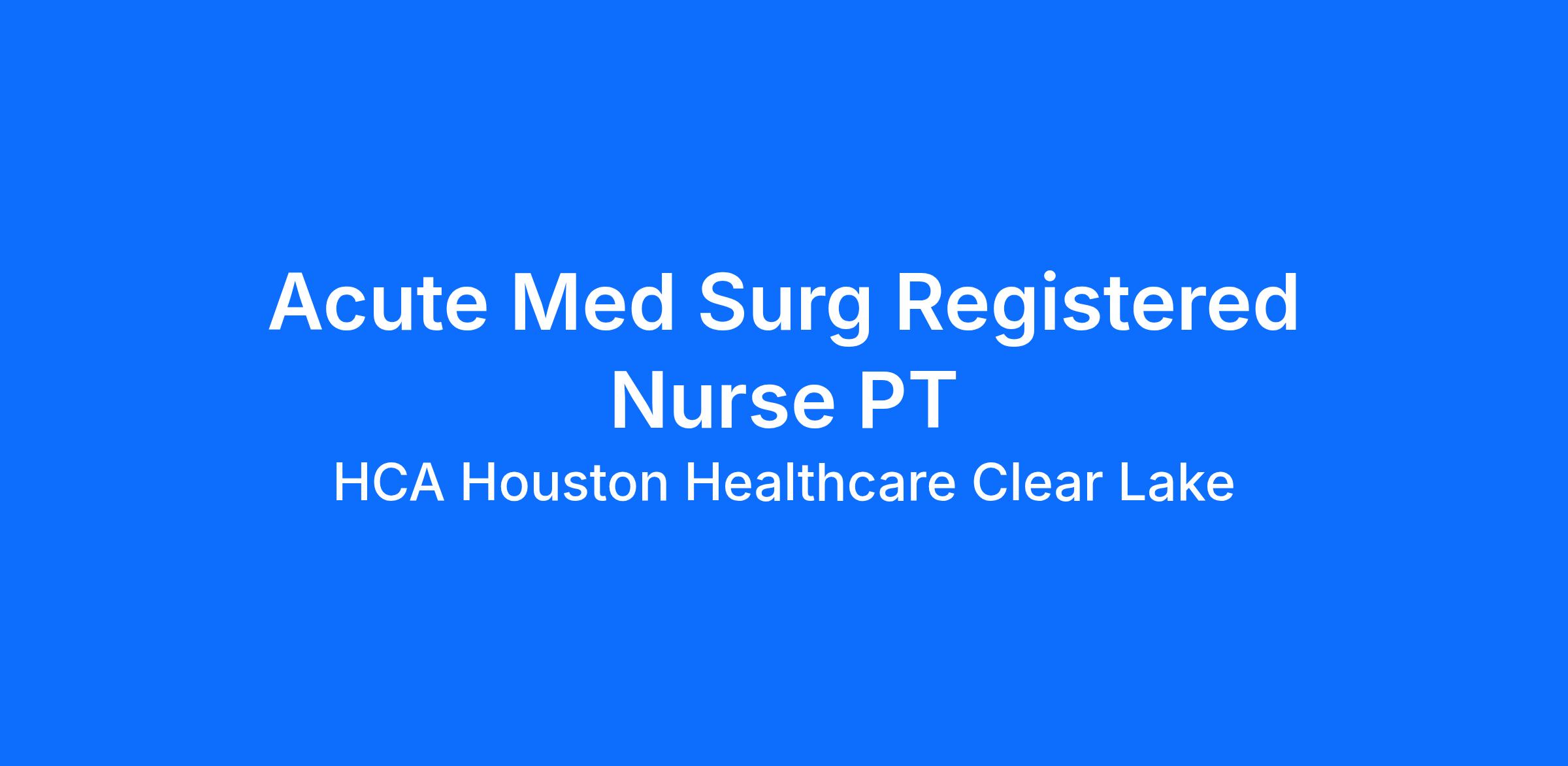 Do you currently have an opportunity to make a real impact with your work? With over 2,000 sites of care and serving over 31.2 million patient interactions every year, nurses at HCA Houston Healthcare Clear Lake have the opportunity to make a real impact. As a Medical Surgical Registered Nurse you can be a part of change.