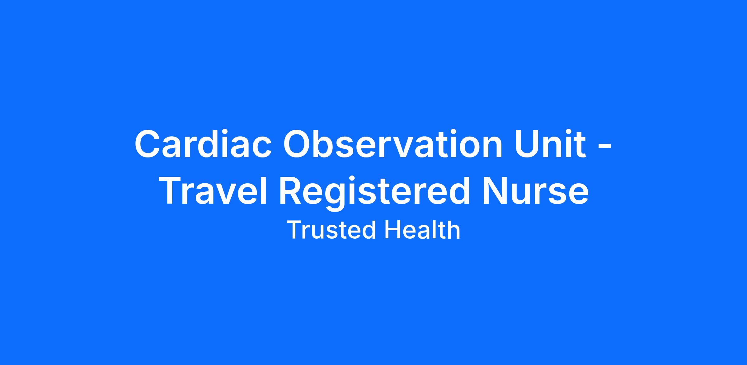 Special Requests: - Cannot apply to more than one job order on the same unit. If multiple shifts are posted, only apply to your preferred shift. - The Cardiac Observation Unit provides pre- and post-procedure care for Cath Lab patients and works with high-risk, high-acuity patients. Bedside procedures performed in the unit include transesophageal echocardiography (TEE) and cardioversions (CV). - Duties include admitting patients; preparing patients for Cath procedures, including charting the pre-procedure checklist, IV starts, and access preparation; preparing patients for cardioversions and transesophageal echocardiograms; recovering patients following Cath after conscious sedation; sedating, circulating, and documenting bedside procedures; and discharging patients with teaching, documentation, and physical discharge.