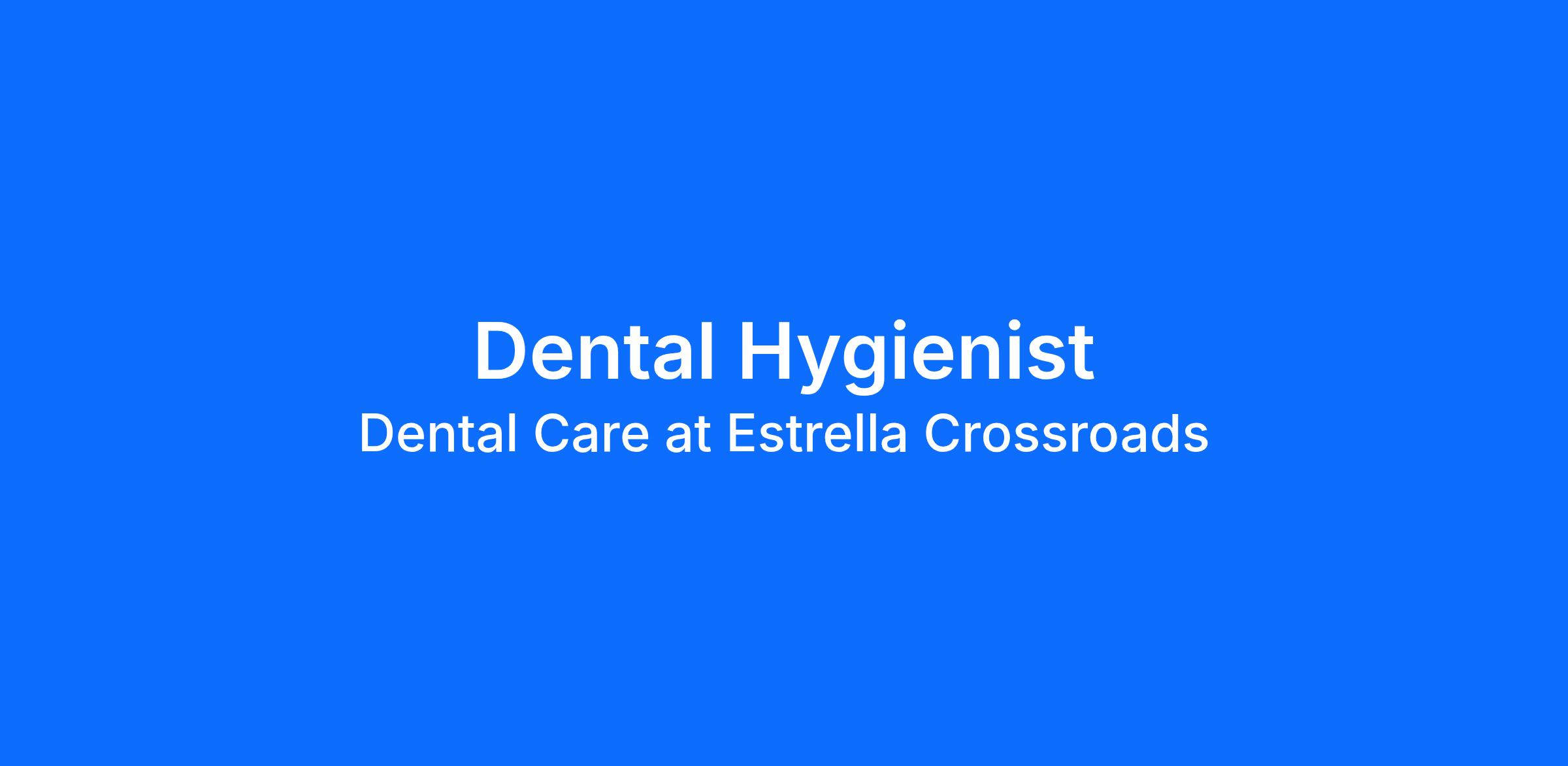 Dental Care at Estrella Crossroads is looking for a Full Time Dental Hygienist to join our team Tuesday; 6:40am-4:00pm Wednesday 7:30am-5pm Thursday 9:40am-7:00pm Friday 7:40pm