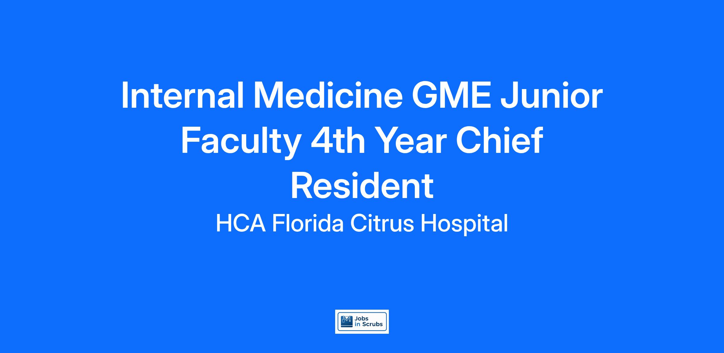 4th Year Chief Resident (Junior Faculty)HCA Florida Citrus Hospital is seeking PGY-4 Chief Residents for its GME Internal Medicine Continuity Clinic. We are seeking candidates with a broad knowledge base, desire for medical education, excellent presentation skills, and dedication to a collaborative environment. The PGY-4 Chief Resident positions are a one-year experience that offers a unique blend of education, patient care, and administration while providing opportunity for developing and enhancing clinical, teaching and administrative skills, leadership ability, and personal growth.