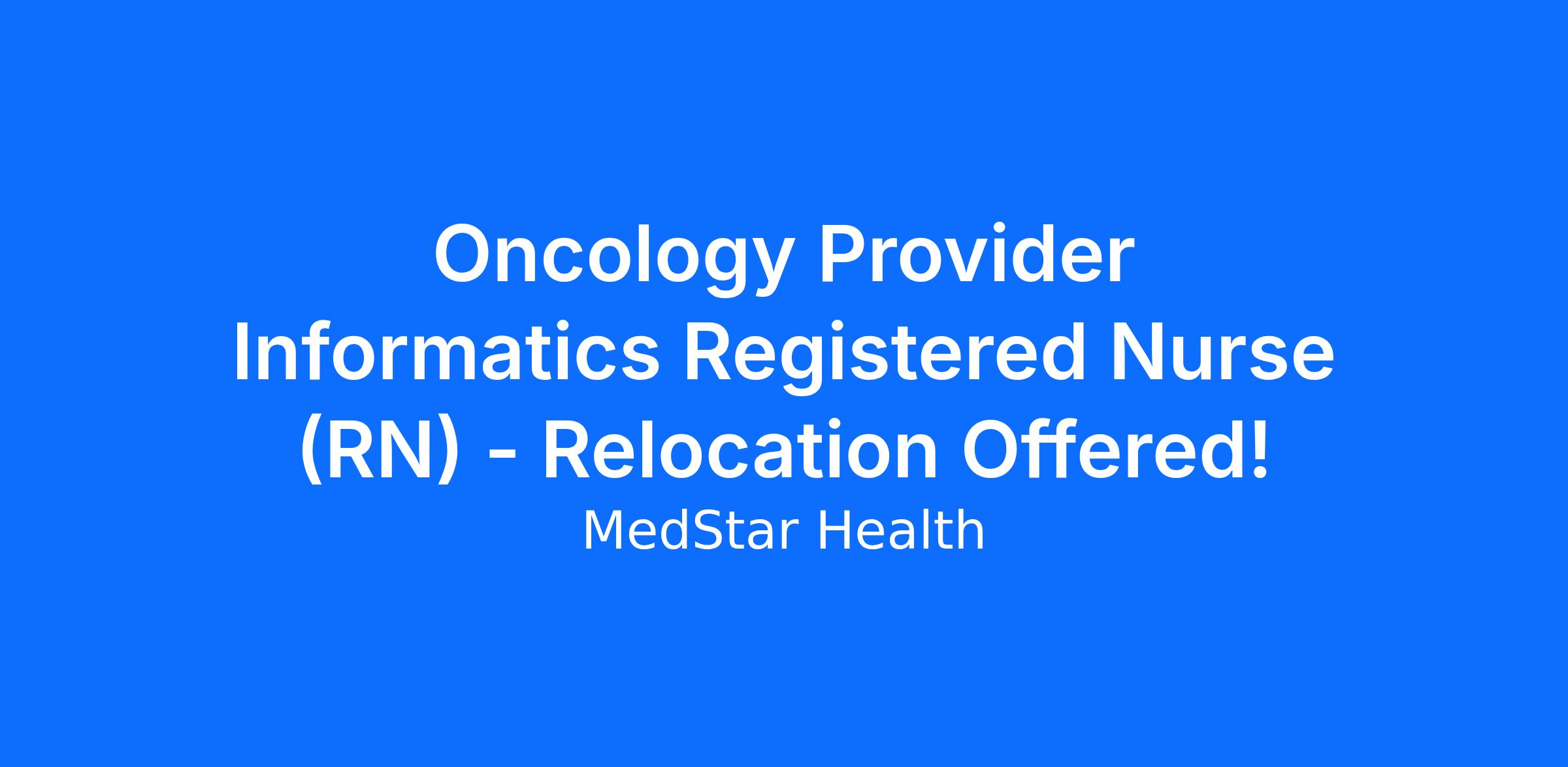 *This Provider Informaticist I position will be based in the Baltimore area and is focused on supporting ambulatory Oncology. Ideal candidate will be an RN with Oncology experience. *