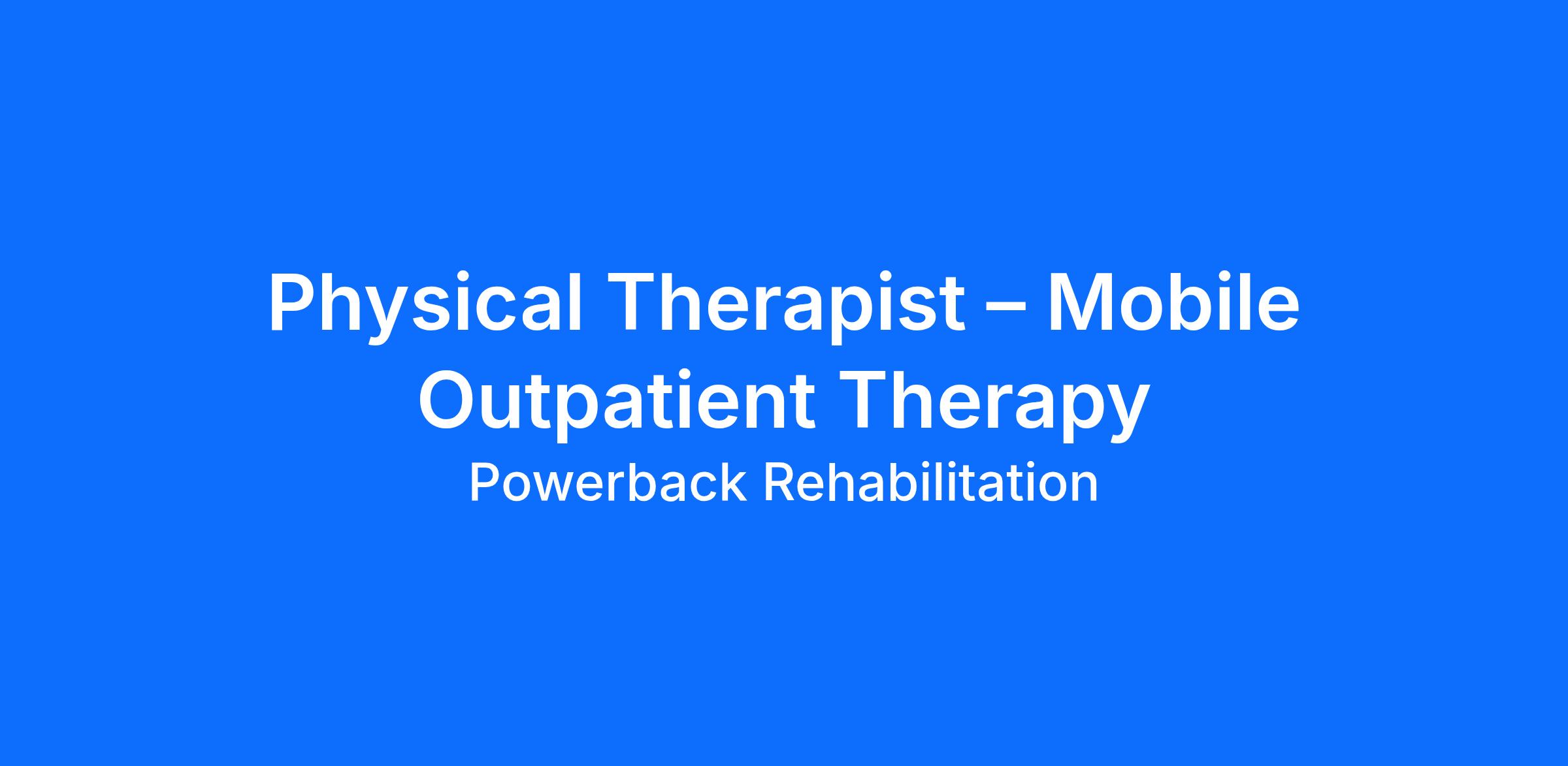 The Physical Therapist will primarily provide outpatient rehabilitation services in an in-home setting for the older adult population. The in-home setting could be a patient’s private residence or in a patient’s room in an independent living facility. Powerback Rehabilitation To You allows the Physical Therapist to evaluate and treat in the most functional environment which is the patient's home. The Physical Therapist assesses the need for, develops, and delivers physical therapy programs to facilitate rehabilitation. The Physical Therapist identifies the need for and makes referral(s) to other disciplines to address the comprehensive needs of patients. They implement individualized therapy programs designed to restore, reinforce, and enhance performance. In addition, the Physical Therapist instructs, educates and trains patients and caregivers in those skills and functions essential for promoting independence and productivity, in order to diminish or correct pathology. They direct activities to promote and maintain health. This position provides a flexible schedule and work environment in various settings.