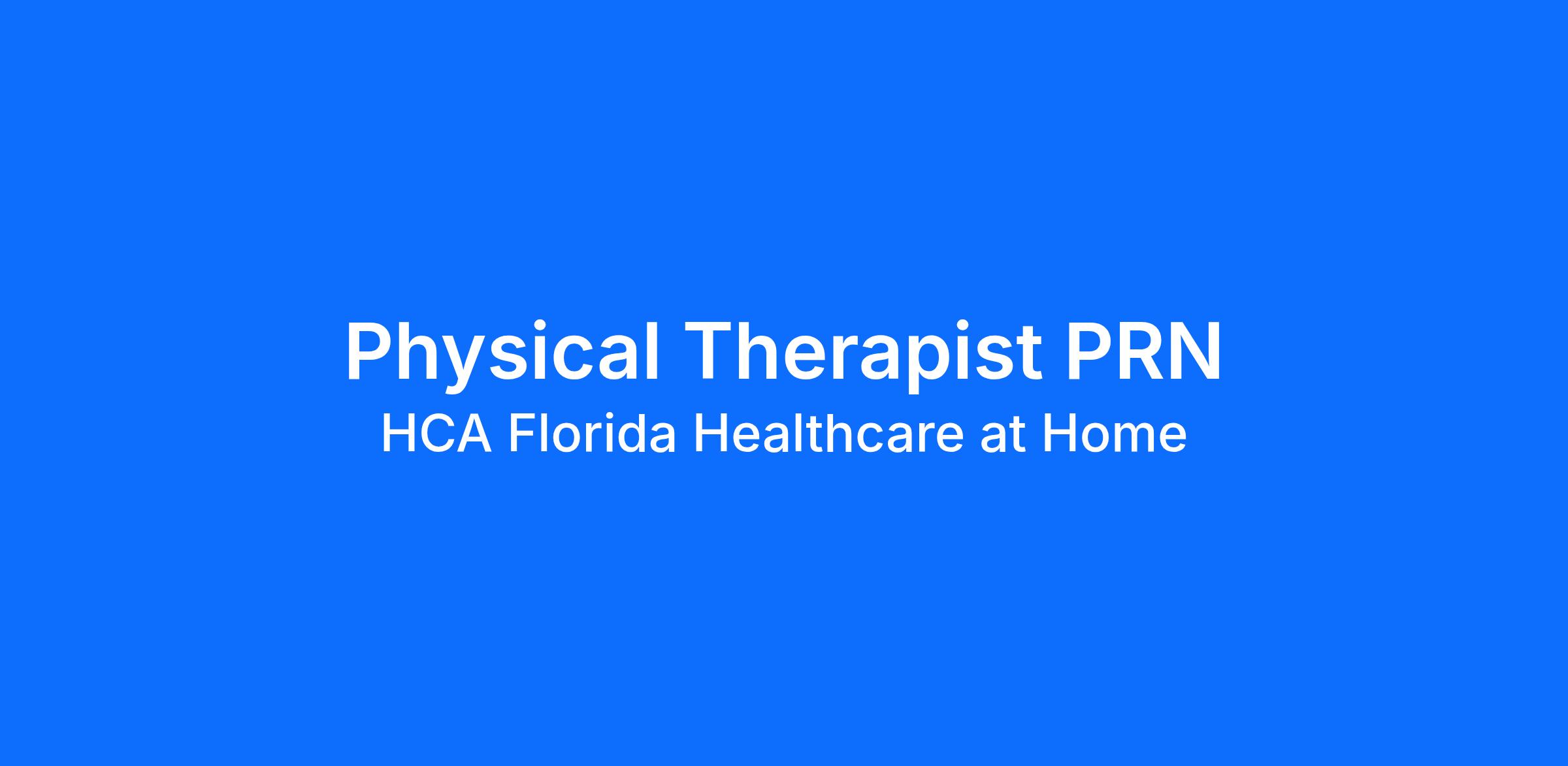 Do you want to join an organization that invests in you as a(an) Physical Therapist PRN? At HCA Florida Healthcare at Home, you come first. HCA Healthcare has committed up to $300 million in programs to support our incredible team members over the course of three years.