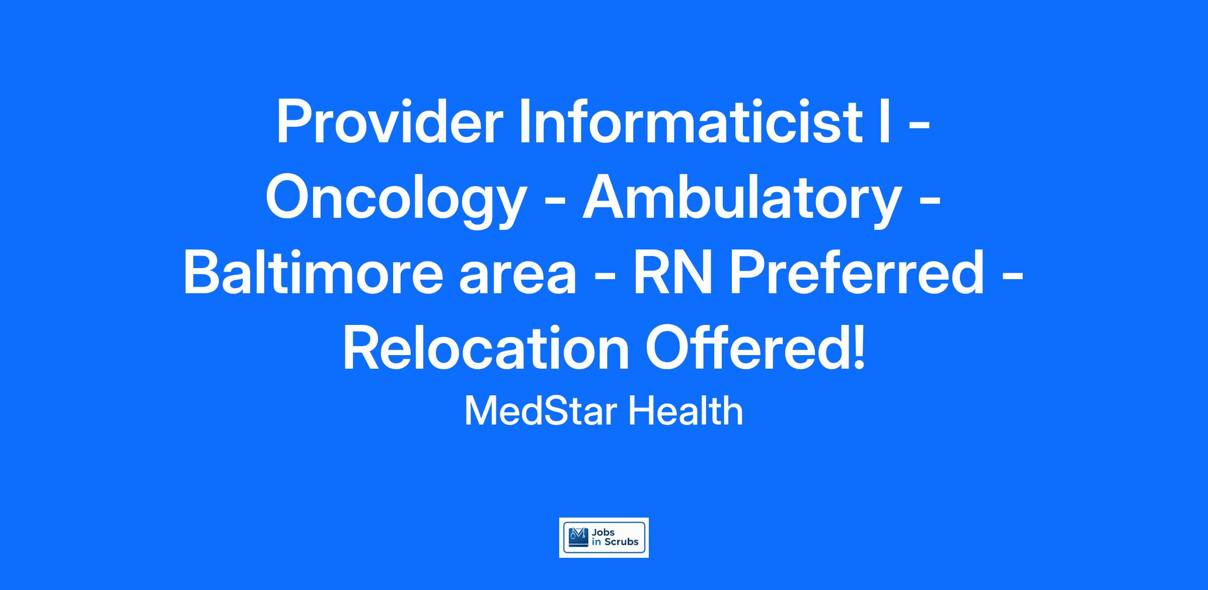 This Provider Informaticist I position will be based in the Baltimore area and focused on supporting ambulatory Oncology. Ideal candidate will be an RN with Oncology experience.