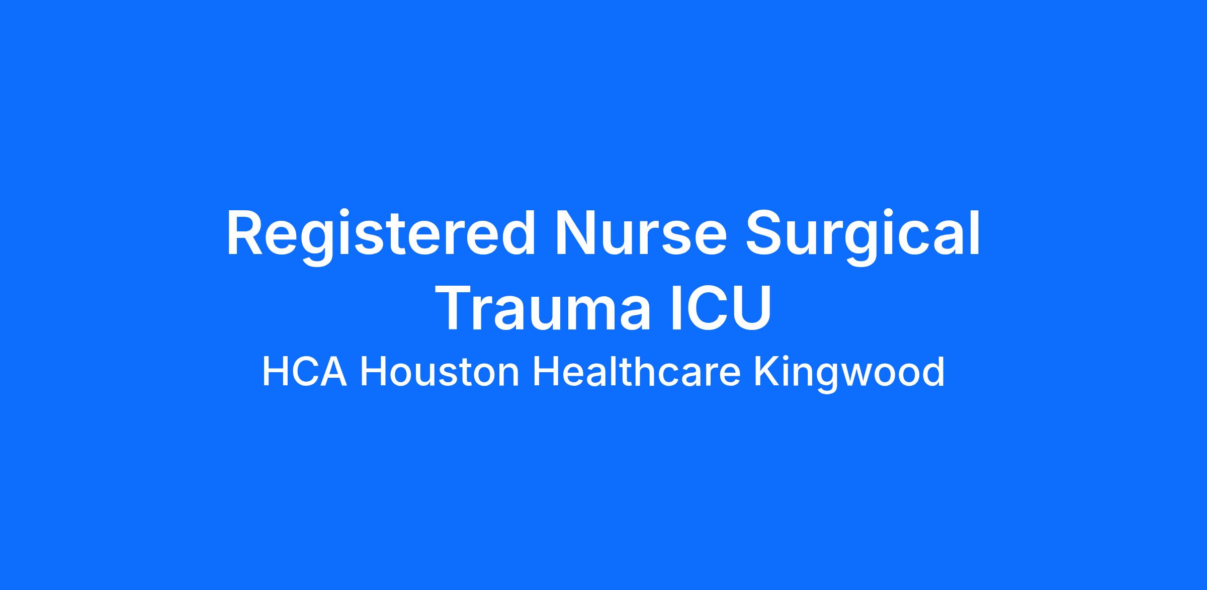 Experience the HCA Healthcare difference where colleagues are trusted, valued members of our healthcare team. Grow your career with an organization committed to delivering respectful, compassionate care, and where the unique and intrinsic worth of each individual is recognized. Submit your application for the opportunity below: Registered Nurse Surgical Trauma ICU HCA Houston Healthcare Kingwood